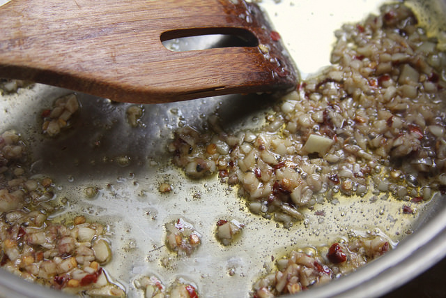 Heat the oil in a large sauté pan over high heat and add the garlic, anchovies and chili flakes. Stir for about 30 seconds, or until bubbling and fragrant. Add the squid and cook, stirring occasionally, for about 5 minutes or until all the liquids released from the squid has mostly evaporated. Add the wine and cook, stirring occasionally, until the wine has mostly evaporated.