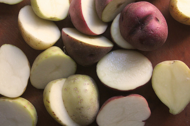 Wash the potatoes and halve them lengthwise (or keep smaller ones intact so that each piece is roughly the same size). Cover with water and bring to a boil. Let boil 6-8 minutes or until the centers of the potatoes are tender when pierced with a fork. Drain and let cool 10-15 minutes.