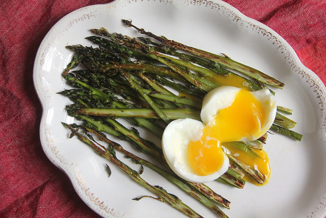 Three brownie points: This is not going to cut it as a complete meal for many, especially if you’re hangry. Consider it for a tasty and nutritious appetizer, side or snack. It’s as simple as asparagus and eggs, and if you’re dealing with fresh, in-season asparagus from a local farm (not insipid, flavorless ones that were harvested long ago and traveled many miles), it’s chock full of vitamins and minerals. Like Vitamin K (the greener the stalks, the more, typically), B-vitamins and fiber. In addition to protein and fats, the egg may also be a good source of omega-3 and additional vitamins, especially if it has very orange yolks from hens that were fed a nutritious spring beta-carotene-rich diet.