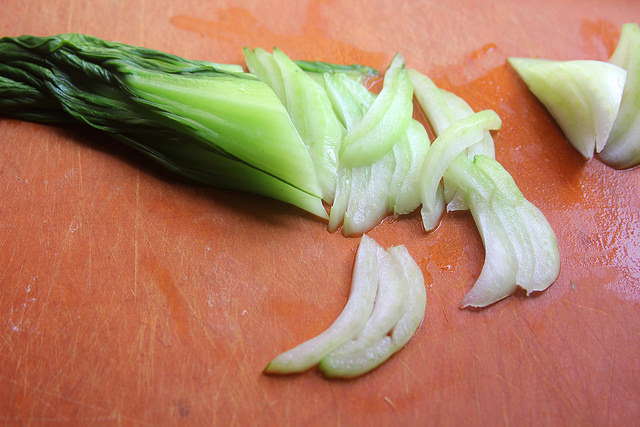 Prepare a bowl with ice water. Bring another pot of water to boil and drop in the bok choy leaves. Cook for 1 minute, then drain and plunge immediately in the ice bath. Once cooled completely, drain the bok choy and squeeze out the water. Finely slice the leaves from stem to leaf.