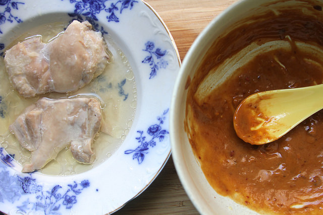 Whisk together the first six ingredients for the sauce, and adjust to taste (adding more chili, vinegar, etc as desired). Once cooled, stir in the 1/2 cup of the chicken cooking juices. Shred or chop the chicken meat.