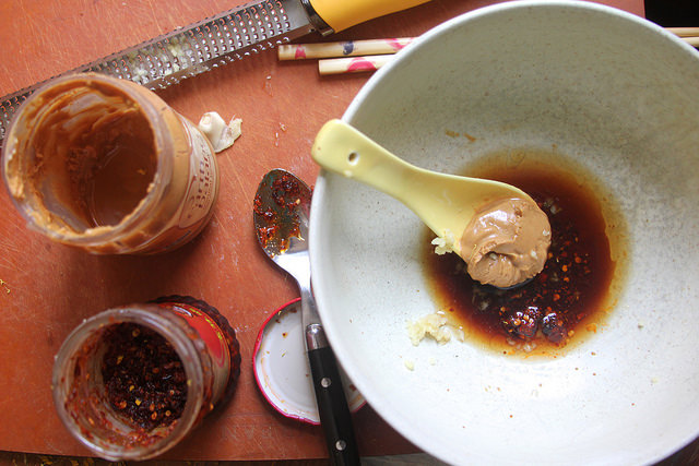 The basic components of the sauce are about equal parts soy sauce and rice vinegar, a drizzle of sesame oil, and an (optional) dab of spicy sauce of some sort (I used toasted Sichuan chili oil, but you could use any chili sauce you like). To thicken it, sesame paste is traditional, but peanut butter is a pretty good substitute, and one that my mom employed plenty of times for these noodles growing up. Since Asian sesame paste is made from toasted sesame seeds rather than raw ones, like with tahini, it has a deeper color and flavor that’s akin to roasted peanut butter. Plus, who doesn’t have peanut butter in their cupboard? Go ahead and use it just the same.