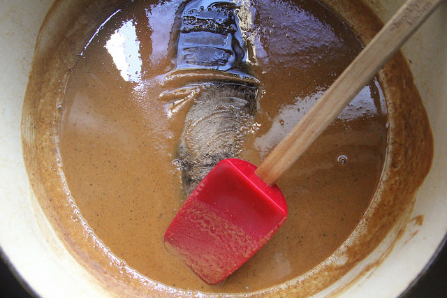 No, not one gumbo recipe nor utterance of it I’ve ever come across had anything to do with squid. But that’s usually reason to do—rather than not to do—something in my kitchen. In the end, the squid looked so crazy, poking out of the pot and the plate of rice it was ladled onto, that I had to share. Mardi Gras is about making noise, going wild and looking outlandish, anyway. While no breasts were flashed at the party in exchange for a string of plastic beads, I think we tried to capture that energy. For dessert, we fried up some beignets to serve with coffee ice cream. And although it wasn’t a proper King Cake a la Mardi Gras dessert tradition, we did stuff one of them with a little surprise; the idea is that whoever gets the piece of cake with the toy inside has to host the next party. So hopefully we’ll all have another try at it soon.