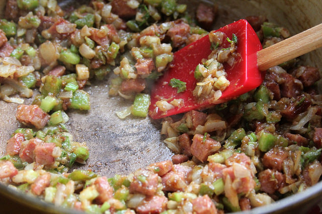 And a lot of other flavors, too. It can be difficult to find the proper ingredients for Creole recipes if you’re not in Louisiana. Andouille sausages evaded me throughout a handful of butcher shops I scoped out in NYC. I eventually found a pack of the French-Cajun sausage links made by the local artisanal charcuterie maker Brooklyn Cured, ironically. And it’s only been in recent years that I’ve been able to find a good source for Gulf shrimp up here, too. I was surprised to find fresh catfish from the US South (rather than Asia) at a fishmonger in NYC, too, and “blackened” a bunch of fillets with Old Bay for another course. Maybe it won’t be too long before we can get our hands on crawfish to boil.