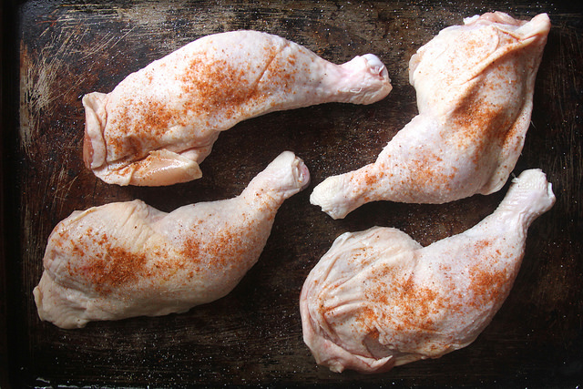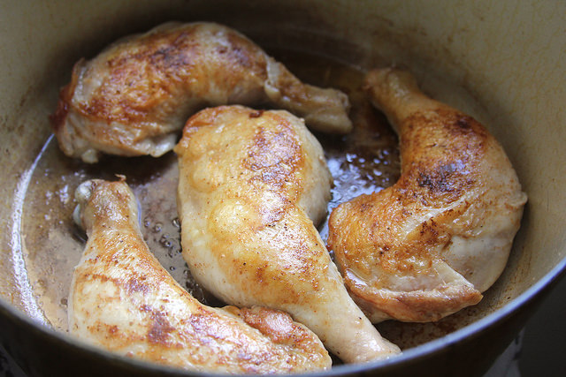 Meanwhile, sprinkle the chicken quarters with ½ teaspoon Old Bay seasoning and rub all over. Heat the tablespoon of oil in a large, heavy pot, such as a Dutch oven. Once oil is very hot, place down the chicken quarters and let brown for about 2 minutes before turning to brown the opposite sides, about 2 more minutes. Remove chicken from pan and set aside. In the same pot, add the 4 tablespoons of butter and flour each and heat over low heat. Stirring, melt the butter and incorporate the flour thoroughly. Continue cooking, stirring frequently, over low heat while the mixture bubbles and thickens, and eventually turns a chestnut brown (about 10 minutes).