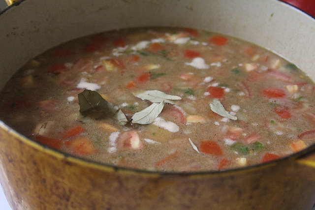 Return the chicken to the pot and add the bay leaves. Strain the shrimp shells from its stock and pour the hot stock into the pot—you should have at 6 cups (add more water to the pot to cover the chicken entirely if not). Stir well and bring to a boil. Bring to a simmer and cover. Cook for 45 minutes-1 hour.