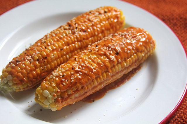 Meanwhile, mix the mayonnaise and gochujang very well, to create a uniform deep-orange sauce. Spread the sauce evenly all over the ears of corn. Sprinkle with the optional sesame seeds and chili flakes and serve immediately.