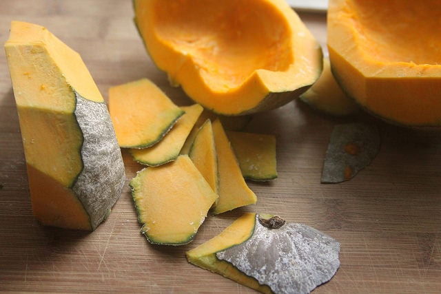 Aren’t they beauties? I am big on buying bags of fruits and vegetables at the farmers market in the late summer, when there are just so many tomatoes, peaches and now apples overflowing from their crates. It’s always a bargain and having too many of them (or a few bruised ones) just means that I’ll have to make preserves or pies with some (or ice cream). My CSA has been delivering winter squashes since early August, too, starting with some delicata squash and then this… I’m not sure if it’s a kabocha squash (aka Japanese pumpkin) or blue hubbard squash of a more flattened shape. But its flesh is very dense and flavorful, like a kabocha or kuri squash, another Japanese variety. It’s pumpkin-y enough in my book, and these denser, sweeter winter squashes are great for pie-making because they’re not as watery as sugar pumpkins. (Though I did see some large pumpkins of the Halloween doorstep variety at the Grand Army Plaza Greenmarket last weekend and it gave me a minor panic attack; summer can’t be over yet! That can wait!)