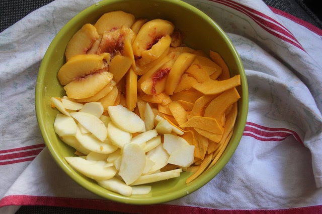 I won’t say that breaking down a fresh winter squash is easy, but I find it fun. After halving the squash, you’ll want to scoop out the seeds. Then, placing the squash on its flat side on the cutting board, cut the skin off, turning the squash as you cut downward all around it. Once the skin has been sufficiently trimmed off, a mandoline will help create the fine shavings that will cook evenly, and soften enough while baking. In the end, the squash creates a textural contrast in the pie, holding firmer amongst the mushy sags of apples and peaches. They don’t taste very prominent, but they do add to the structure of the filling. Add as much or as little of each to the squash-apple-peach mixture as you like, depending on what you like best.