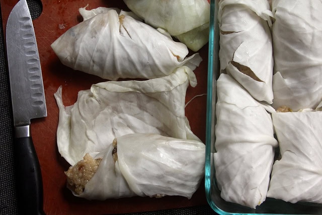Eastern European stuffed cabbage rolls often get a slightly sweet-and-sour tomato sauce poured over them in a casserole dish before baking, adding some tangy contrast. I didn’t want to just leave my rolls naked while they baked in the oven. Though they probably didn’t need much juice—the cabbage leaves release liquids as they cook down—I made a quick, garlicky, mushroom sauce thickened with a bit of cornstarch to drizzle over the rolls before popping into the oven.