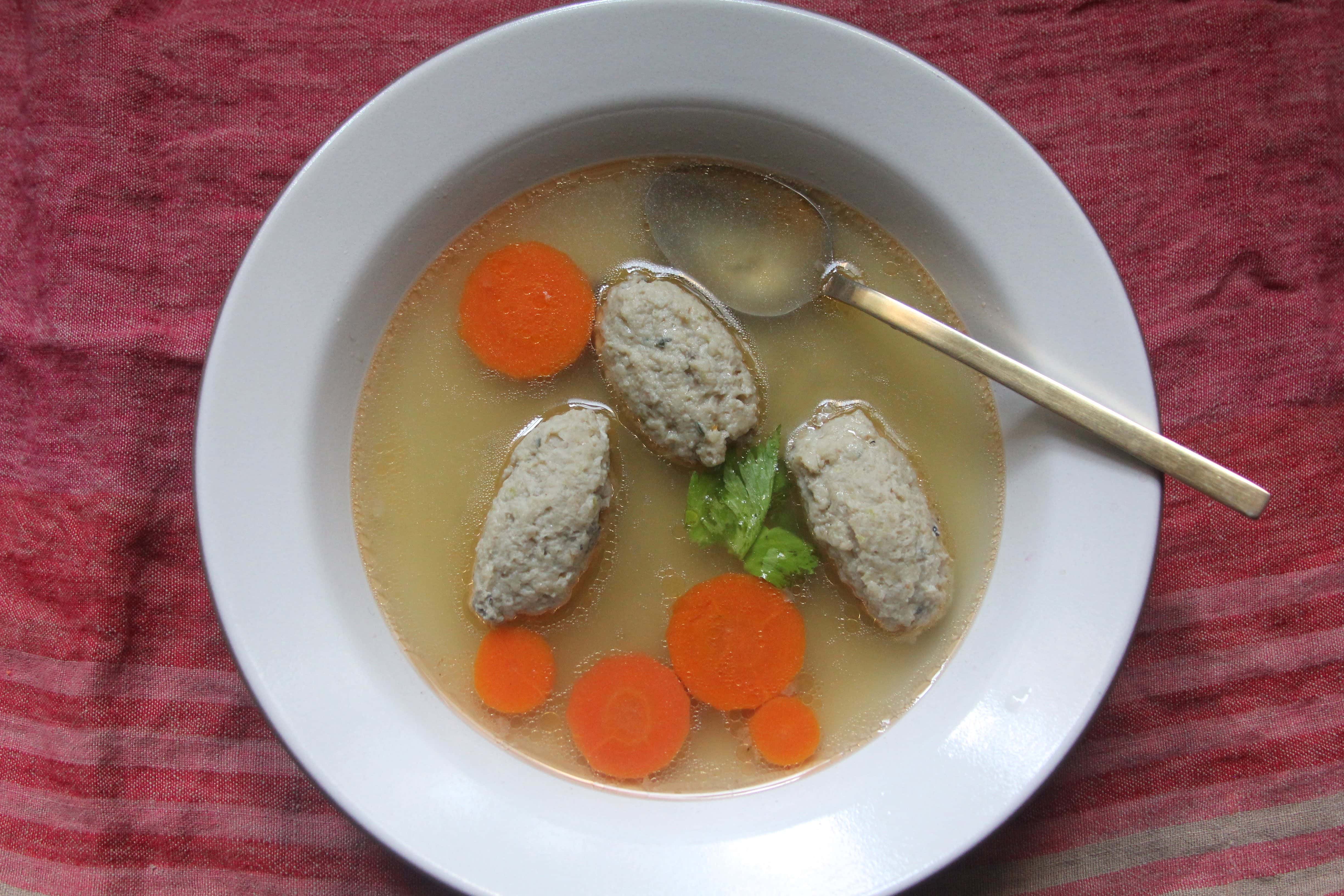 Bring the strained stock with the carrot rounds to a boil. Carefully drop the quenelles of fish mixture into the water. Let poach for 8-10 minutes, or until they’re all bobbing to the top (you may need to work in batches). Then, the quenelles and carrot rounds can be lifted out with a strainer and chilled separately from the stock, which will gel once fully cooled. The gefilte fish and carrots can be served with the chrein. (This works well for a group appetizer before dinner, but I also like a nontraditional way of serving it, which is piping hot, with the broth in a bowl. So do whichever service style suits you.) The gefilte fish and the stock can also be chilled overnight together before serving.